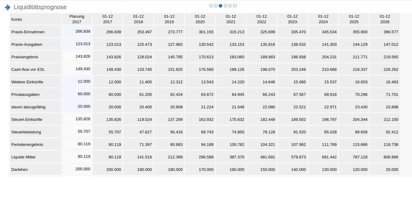 Im Normalfall gilt, dass sich der Arzt nicht selbst um die betriebswirtschaftlichen Aspekte kümmert, sondern sie an seinen Steuerberater delegiert. Hier ist unsere Liquidätsprognose eine sinnvolle Ergänzung des Beratungsportfolios für Dienstleister, da es die zentralen Eckdaten über einen Zeitraum von 10 Jahren aufbereitet und darstellt.